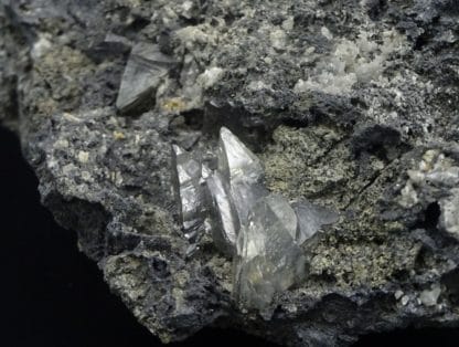 Colorless prismatic crystals of transparent, vitreous-luster, satin-finish anglesite on a galena matrix.