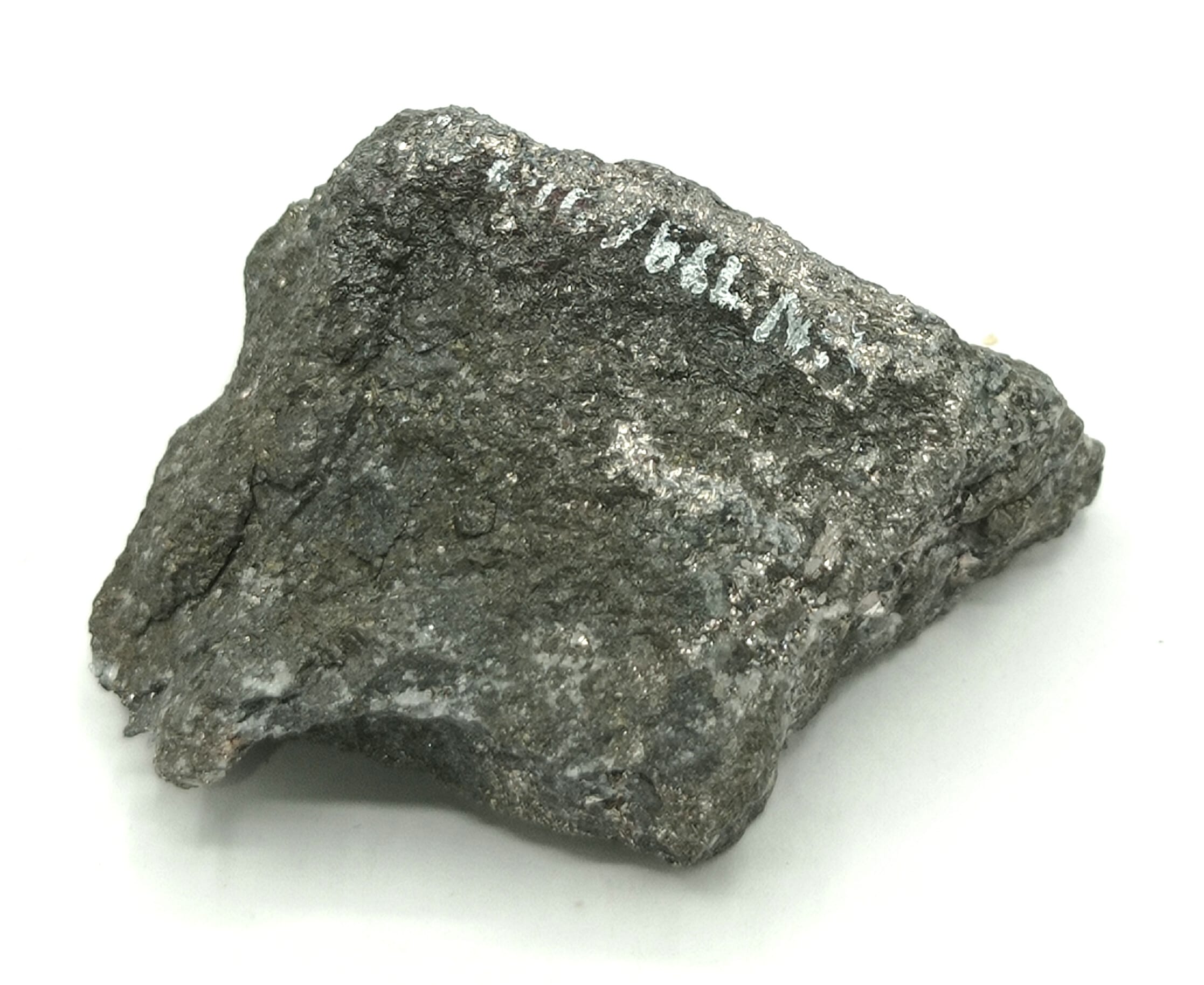 Dense specimen of gray to golden native bismuth. Some old, illegible writing is visible on the piece.