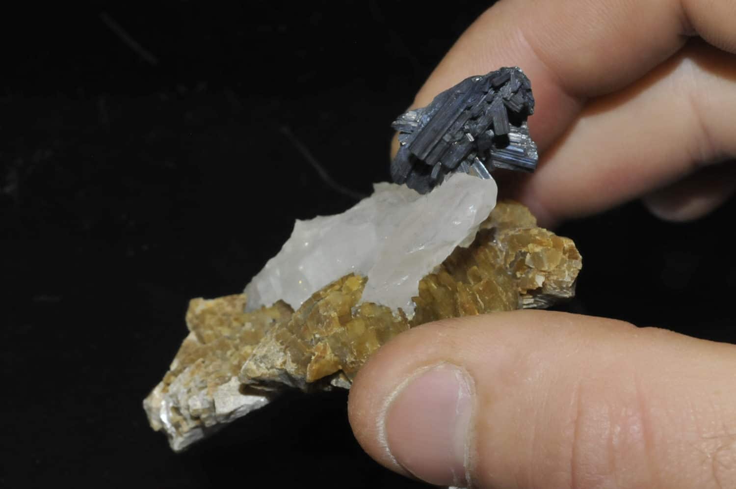 Bournonite on siderite from Saint-Pons, near Barcelonnette, Alpes-de-Haute-Provence, France. As always, the crystals of bournonite or another minerals were cleared from their calcite gangue. The main bournonite crystal is about 2.5 cm.