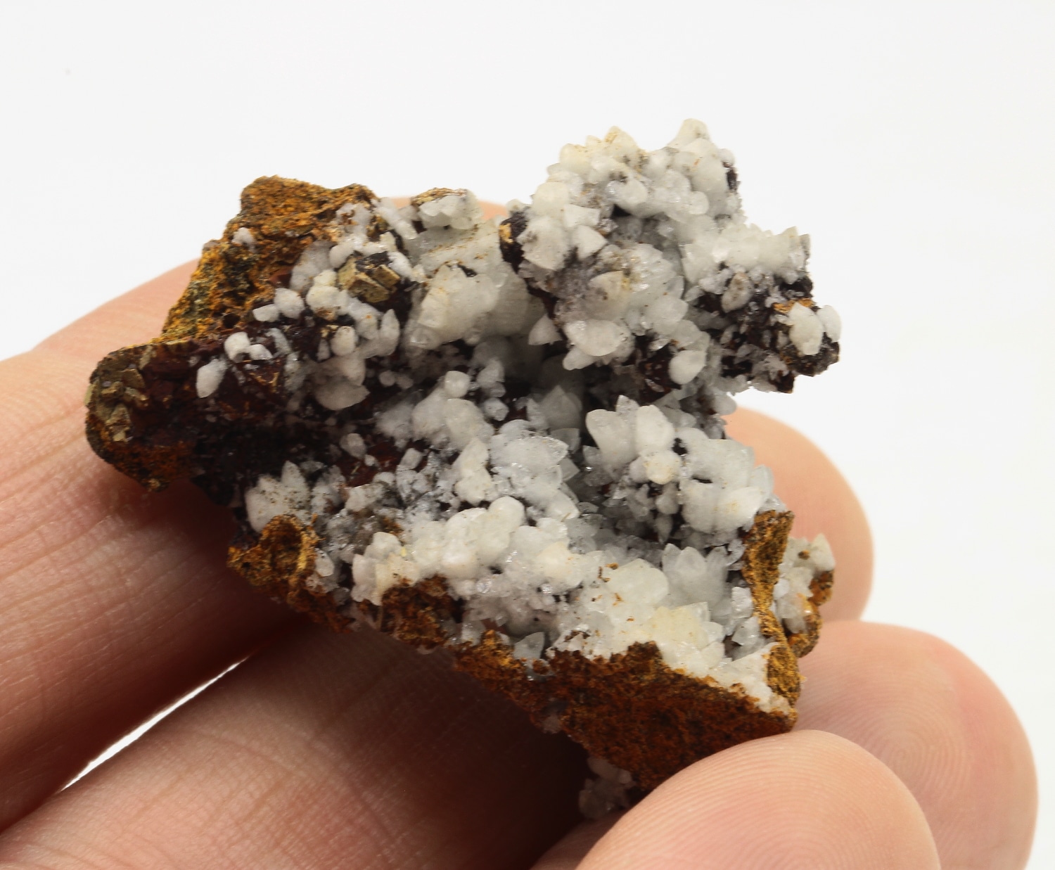 Miniature rich in small, milky-white calcite crystals, somewhat ovoid in shape, or like a grain of rice. A strange and rare specimen from the Armée Céleste mine in Sainte-Marie-aux-Mines.