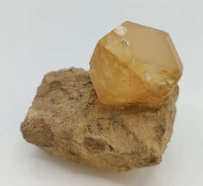 Magnificent floating specimen displaying a magnificent dodecahedral crystal of multi-centimetric honey calcite with frosted and shiny faces, accompanied by smaller crystals.