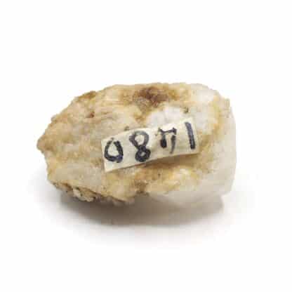 Small white calcite crystal on crystallized yellow dolomite, minerals from the Gabe Gottes mine at Sainte-Marie-aux-Mines, Haut-Rhin department, Alsace, in the Vosges mountains.
