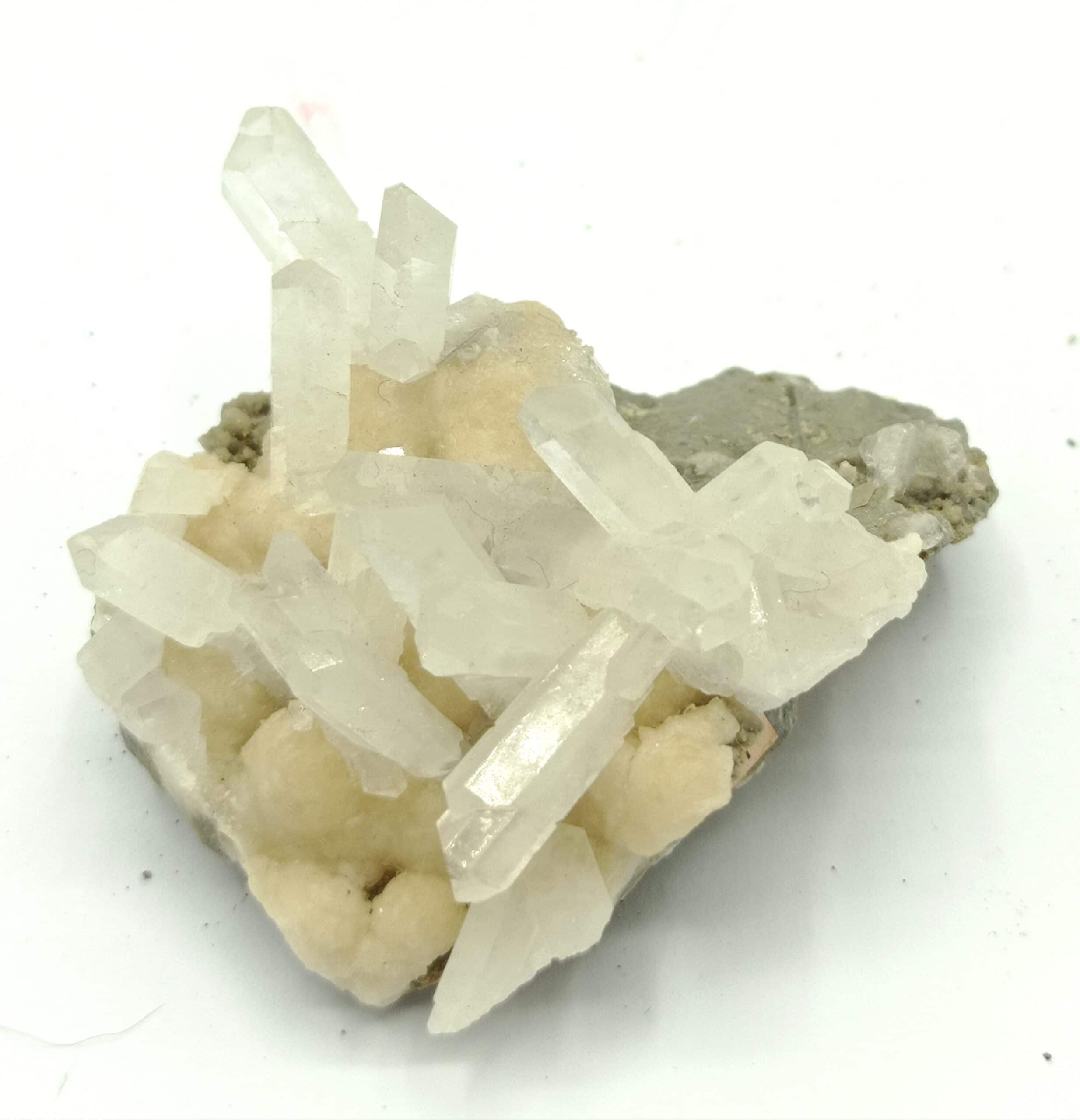 Large, colorless celestine (or celestite) crystals associated with mameloniated beige aragonite and fine sulfur crystals from Caltanissetta in Sicily, Italy. High place for sulphur and celestite crystals.
