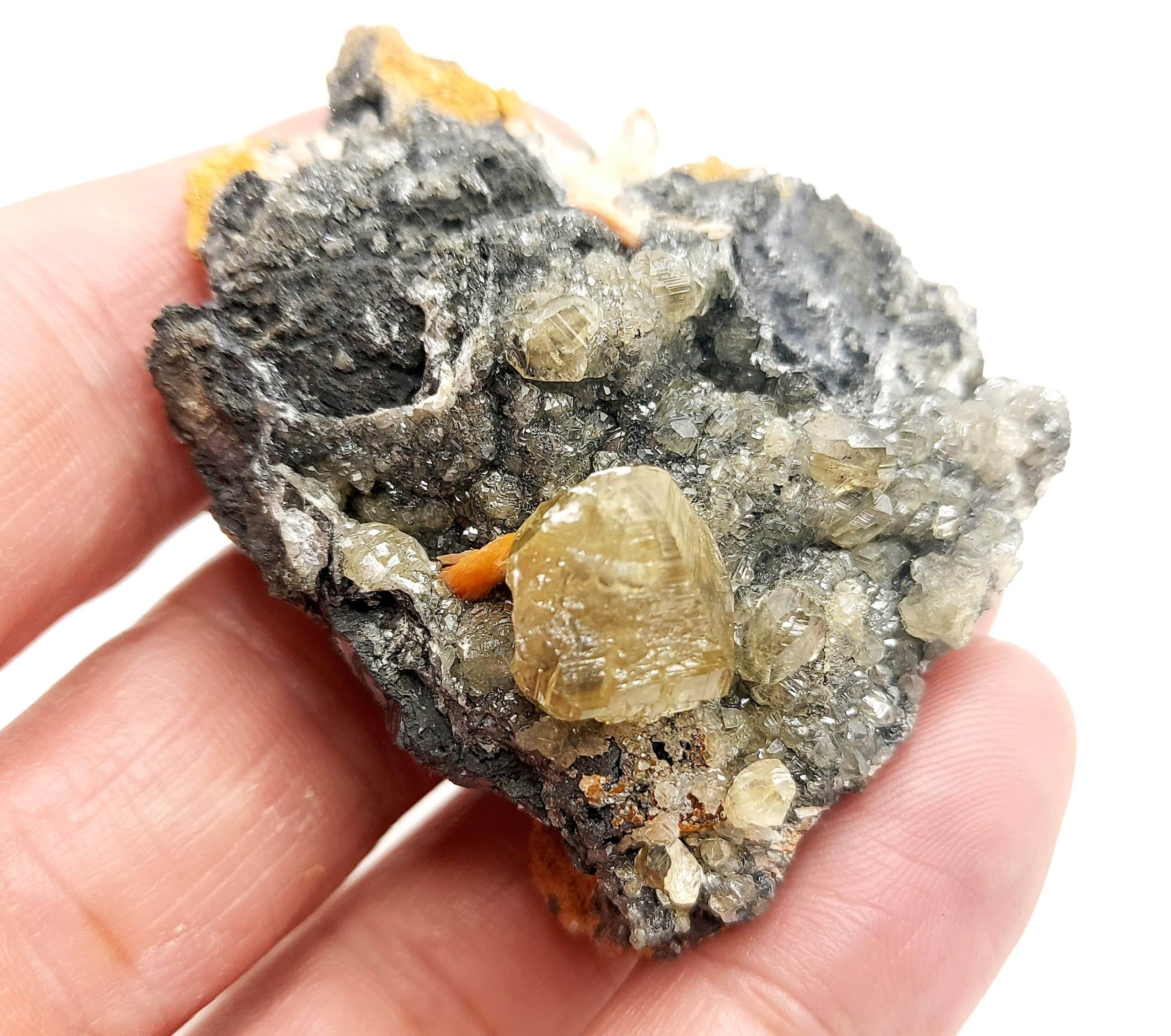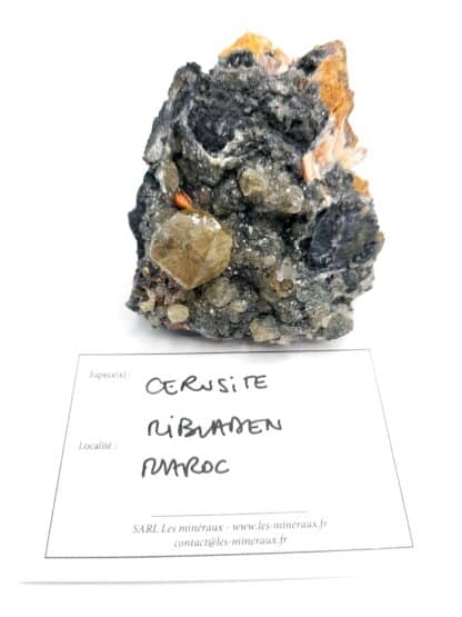 Translucent cerussite crystals set on rather amorphous, massive crystals of dark galena, with occasional metallic flakes. From one of the Mibladen mines in Morocco. Mineralogy typical of the region.
