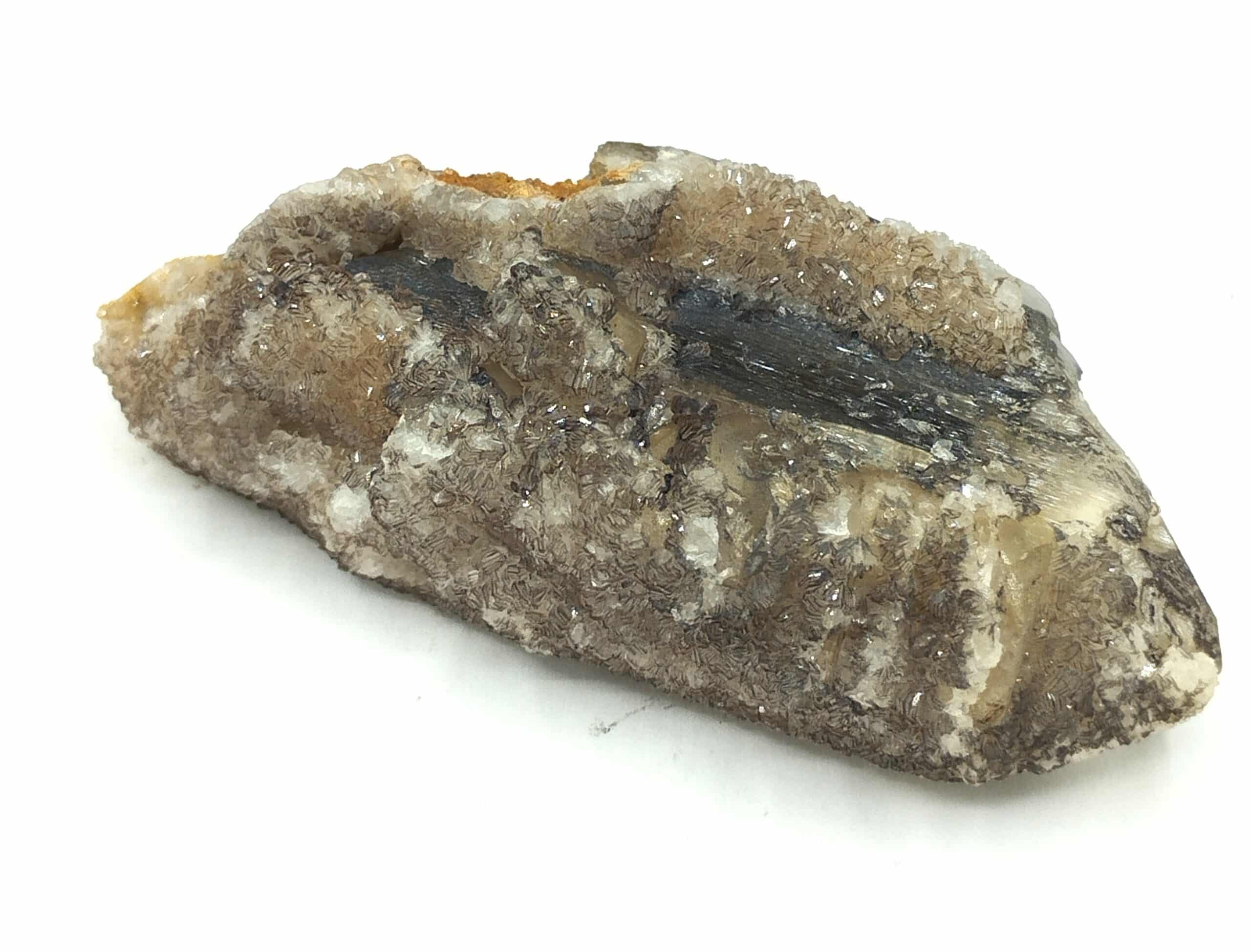 Superb crystal of cerussite, a lead carbonate, automorphic and very bright, partially covered with small crystals of cerussite and calamine (zinc and iron oxide). A cerussite specimen from the M’Fouati mines in the Democratic Republic of Congo. Excellent for the locality, and a historic specimen to boot.