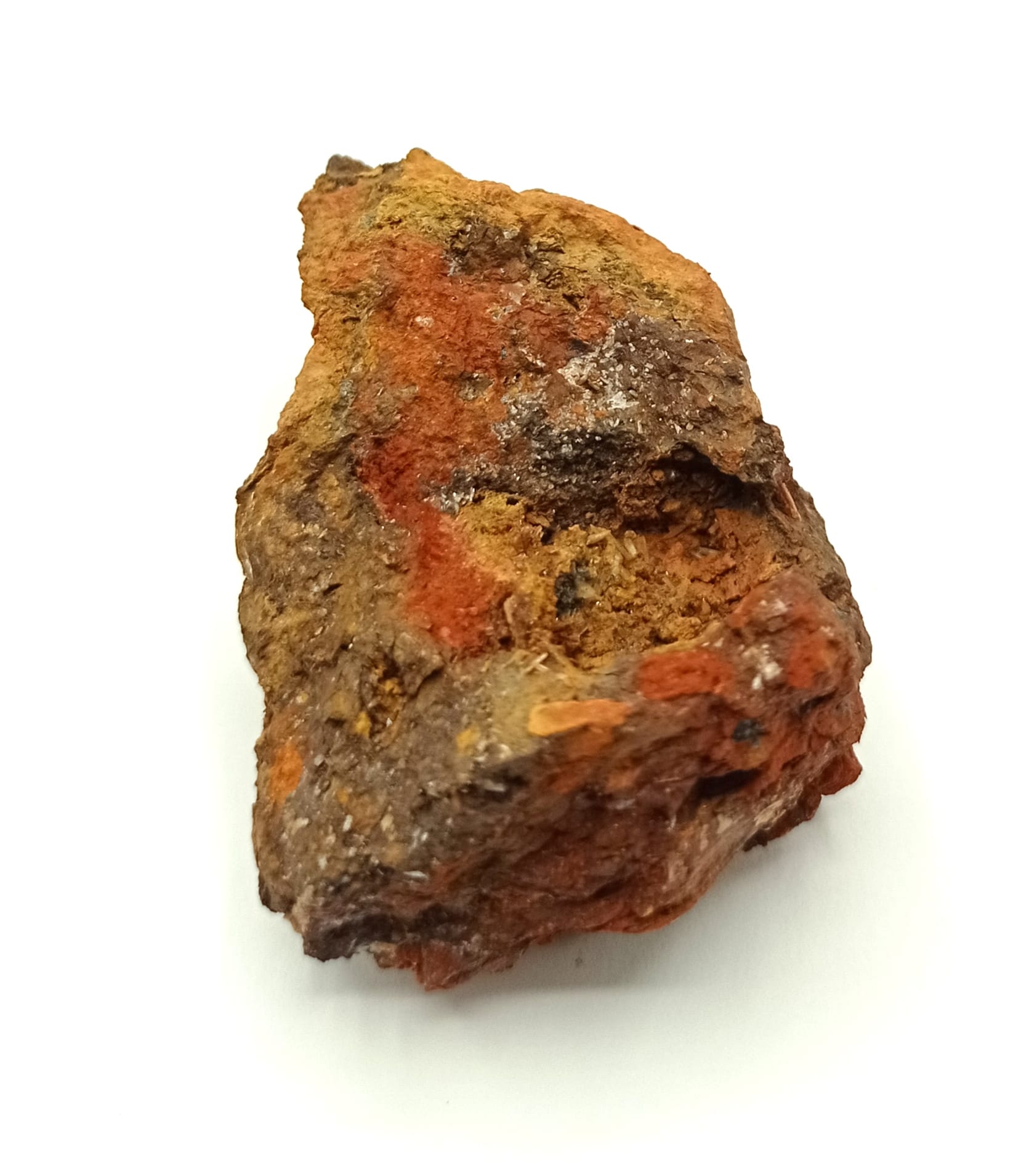 Geode with acicular cerussite crystals covered with orange iron oxides.