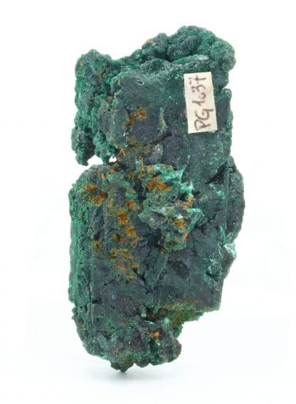 Large crystal of azurite entirely pseudomorphosed in very brilliant malachite. This sample comes from Morocco, and was part of Philippe Glastre’s collection, recovered by exchange in 1983, numbered PG 1037.