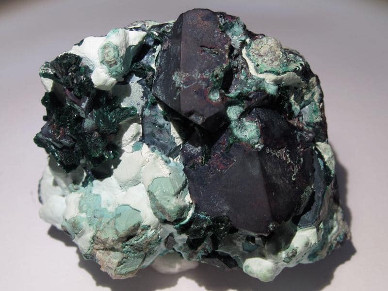 Sample showing two beautiful, large cuprite crystals (almost 20 mm) associated with very nice, really bright, intensely colored malachite crystals standing out against a very, very pale green background.