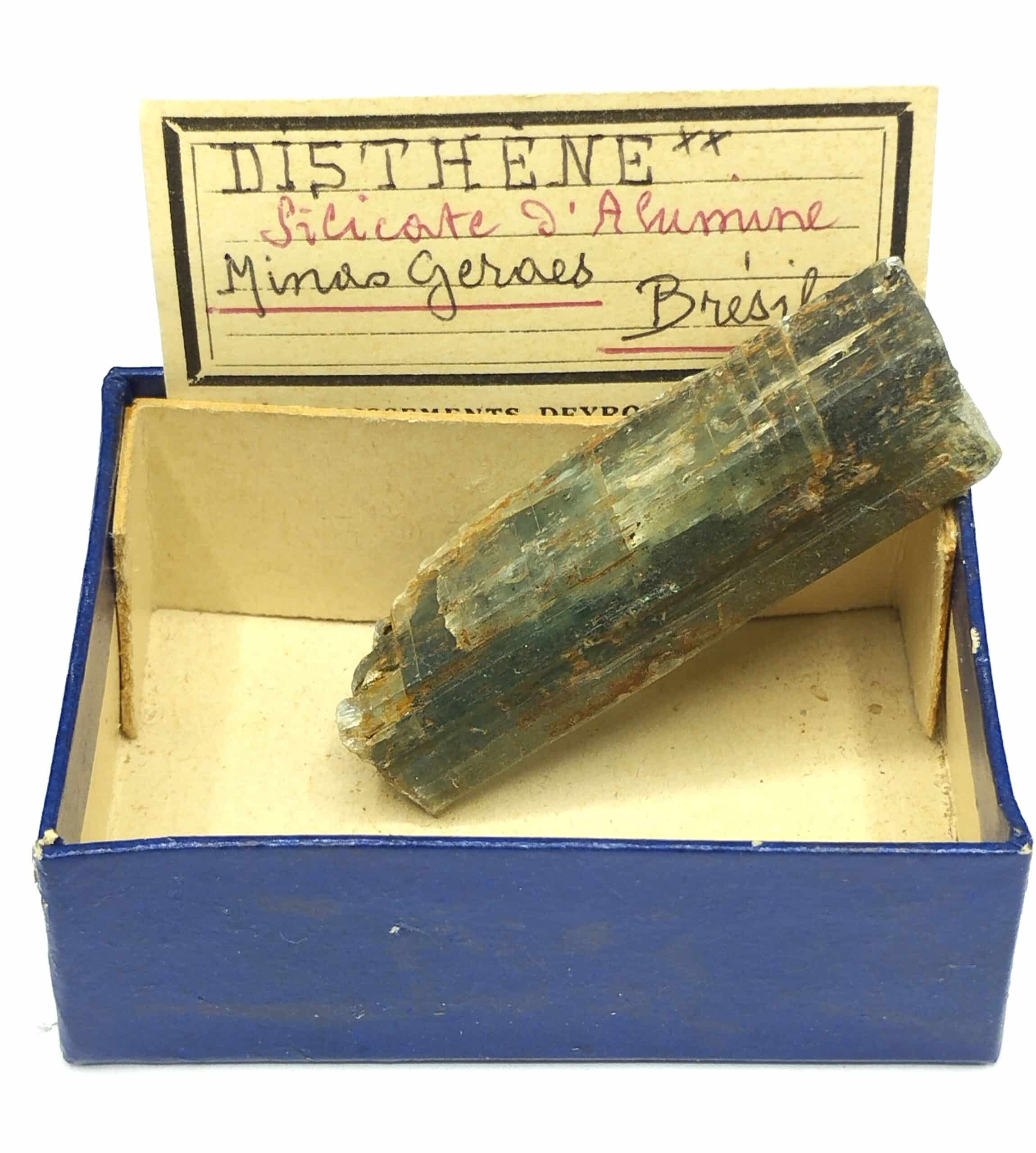 Good blue-green kyanite crystal from the Minas Gerais province in Brazil. Specimen of the collection of the naturalist merchant Deyrolle, of Paris, provided with box and label of origin (XIXth century).