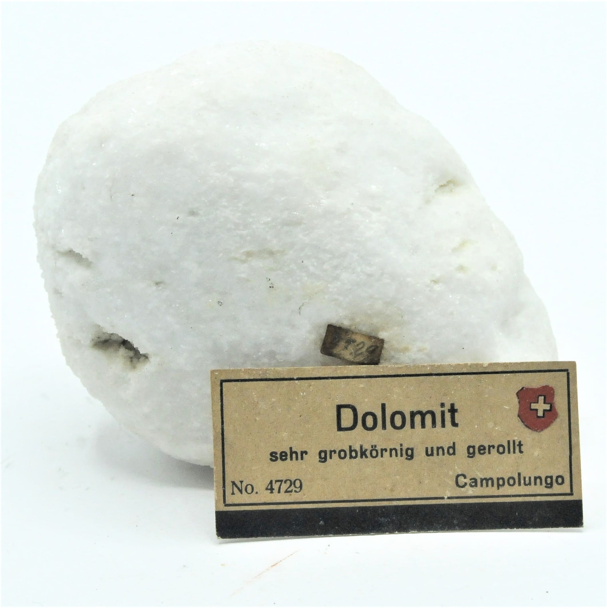 Large, coarse-grained, very white aragonite pebble. This is a 19th century piece from the mineralogical collection of the Bally Museum in Schönenwerd, Switzerland. Supplied with its antique label.