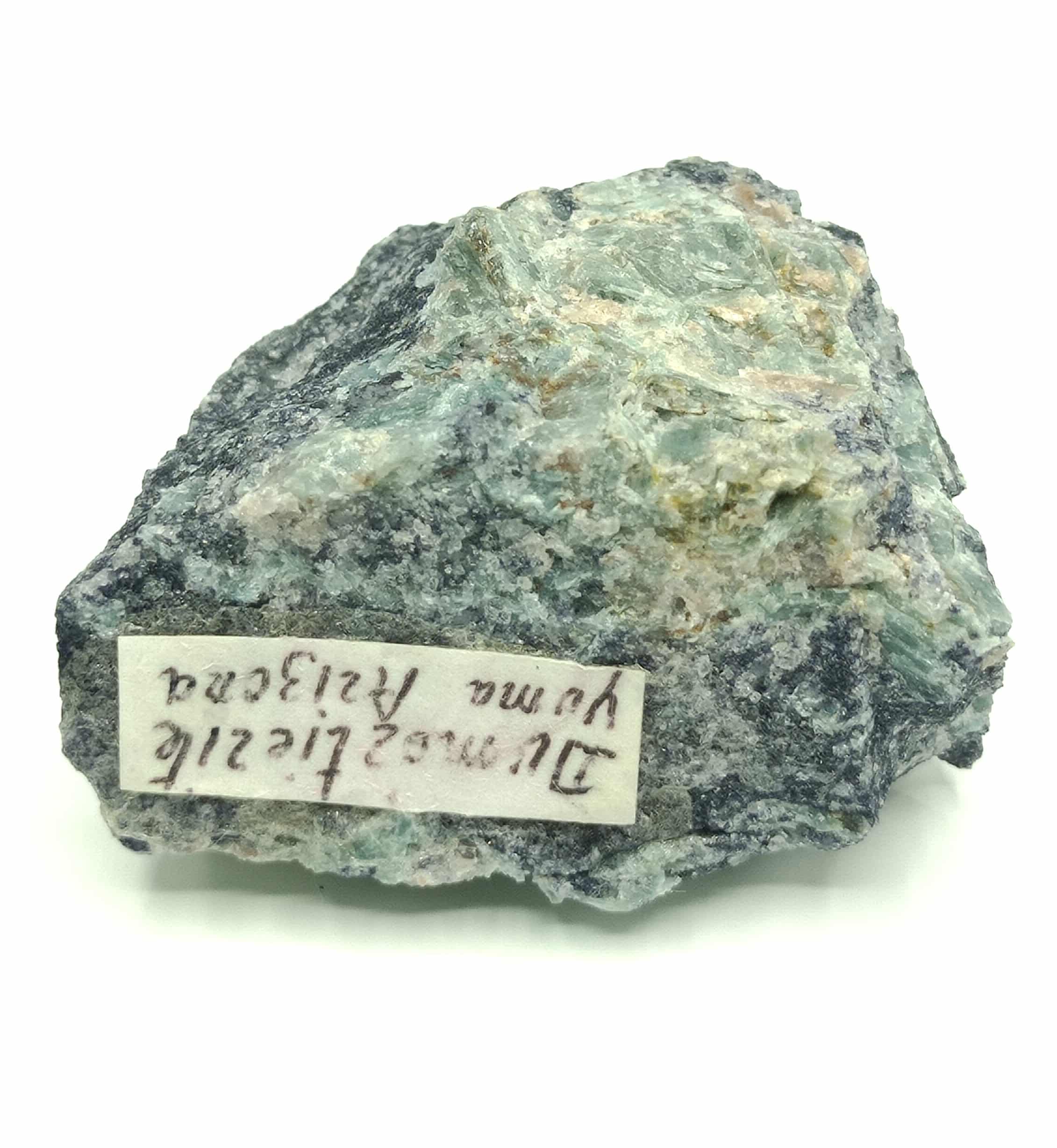 Here it appears as bright blue to green, flat crystals in dark rock.