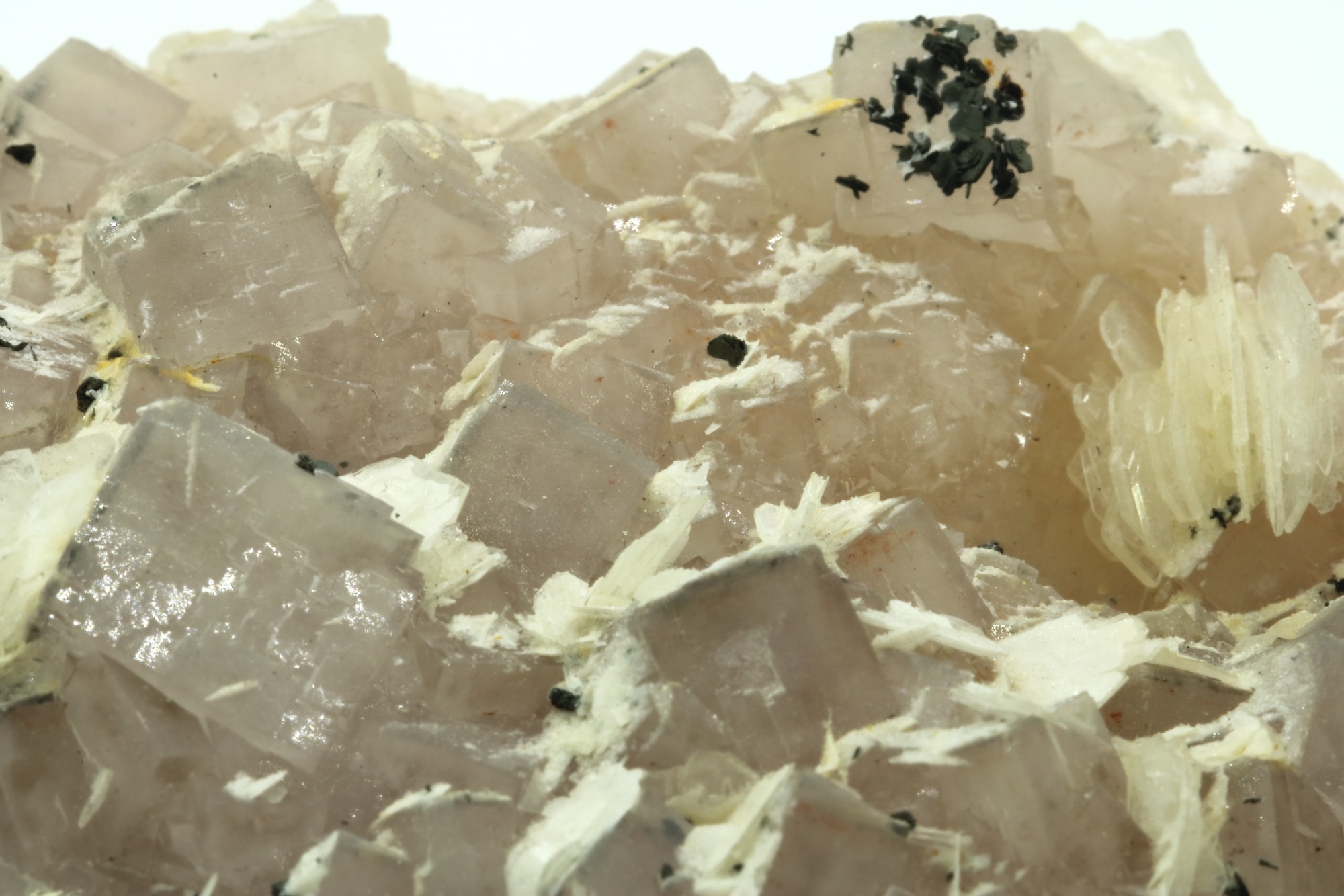 Beautiful floating (recrystallized) plate showing mauve cubes of fluorite with whitish ghosts partially covered by lamellae of white barite, sometimes gemstone.