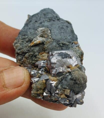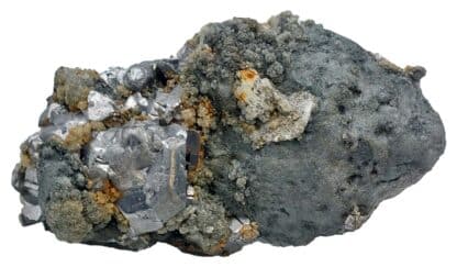 Polysynthetic galena crystals with a molten appearance surrounded by fibrous boulangerite known as plumosite.