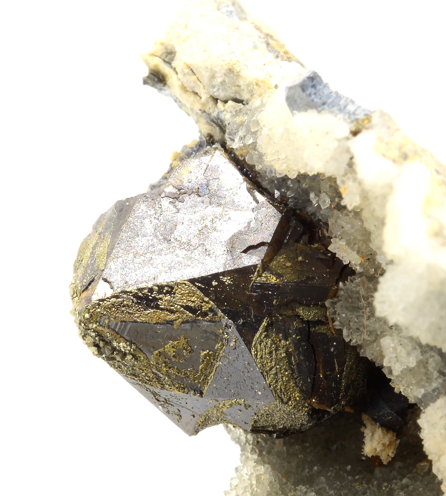 Very good crystal (1.2 cm) of sphalerite (blende), brilliant, sprinkled with golden pyrite and accompanied by orange sphalerite (blende) and galena, all set on micro-crystallized quartz. This lovely miniature comes to us from Silbertharücken, in Steinbach in the Haut-Rhin region of Alsace, in the Vosges mountains.