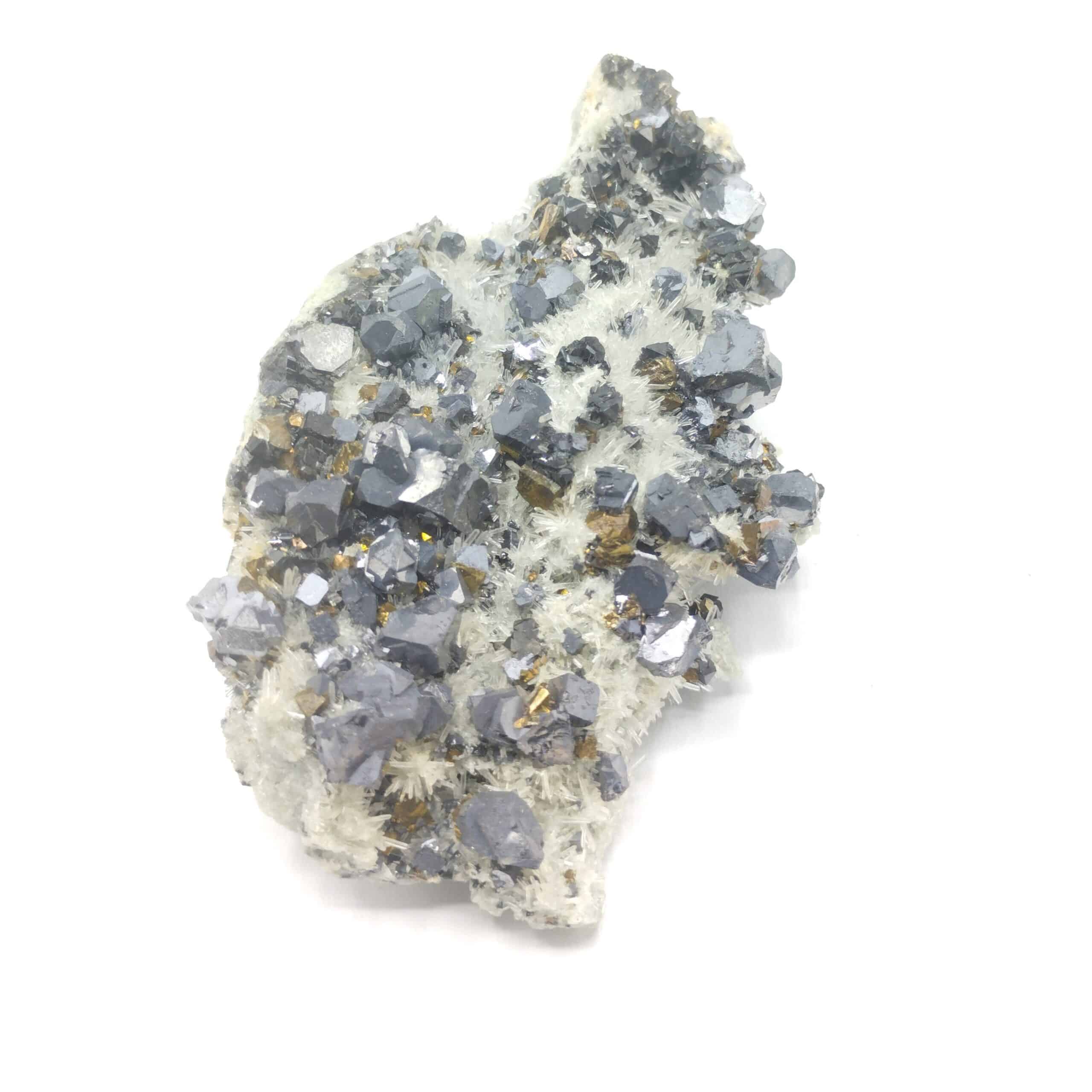 Beautiful set of macerated galena crystals in association with chalcopyrite and fine quartz crystals.