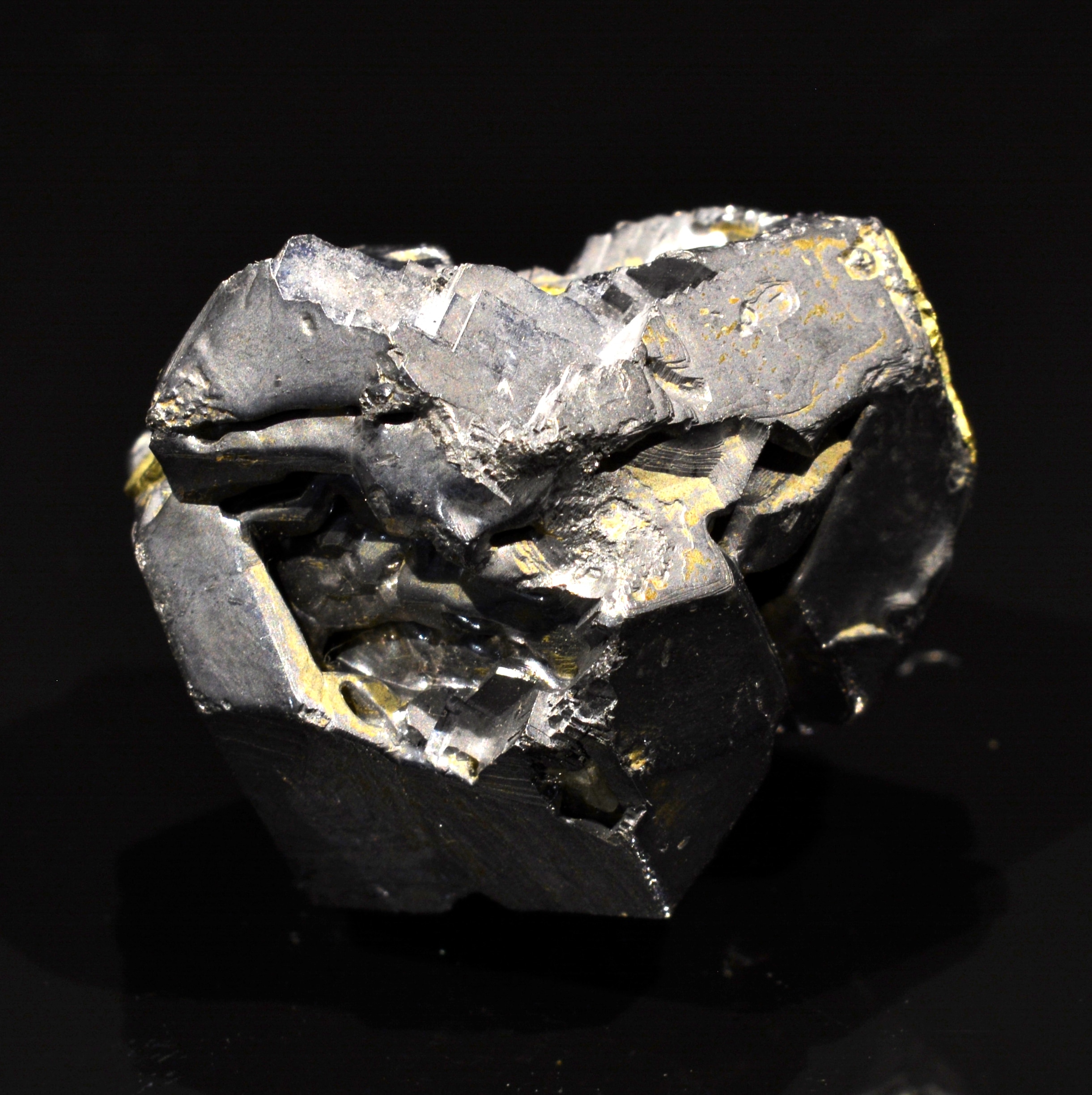 Beautiful floating octahedron of brilliant galena with a slightly “melted” appearance, associated with chalcopyrite.