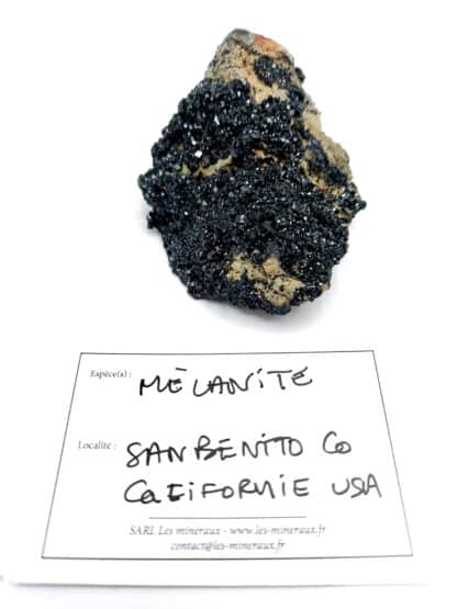 Beautiful specimen of brilliant black melanite garnet crystals on gangue, from the San Benito mine in California, particularly known for its benitote crystals associated with neptunite.
