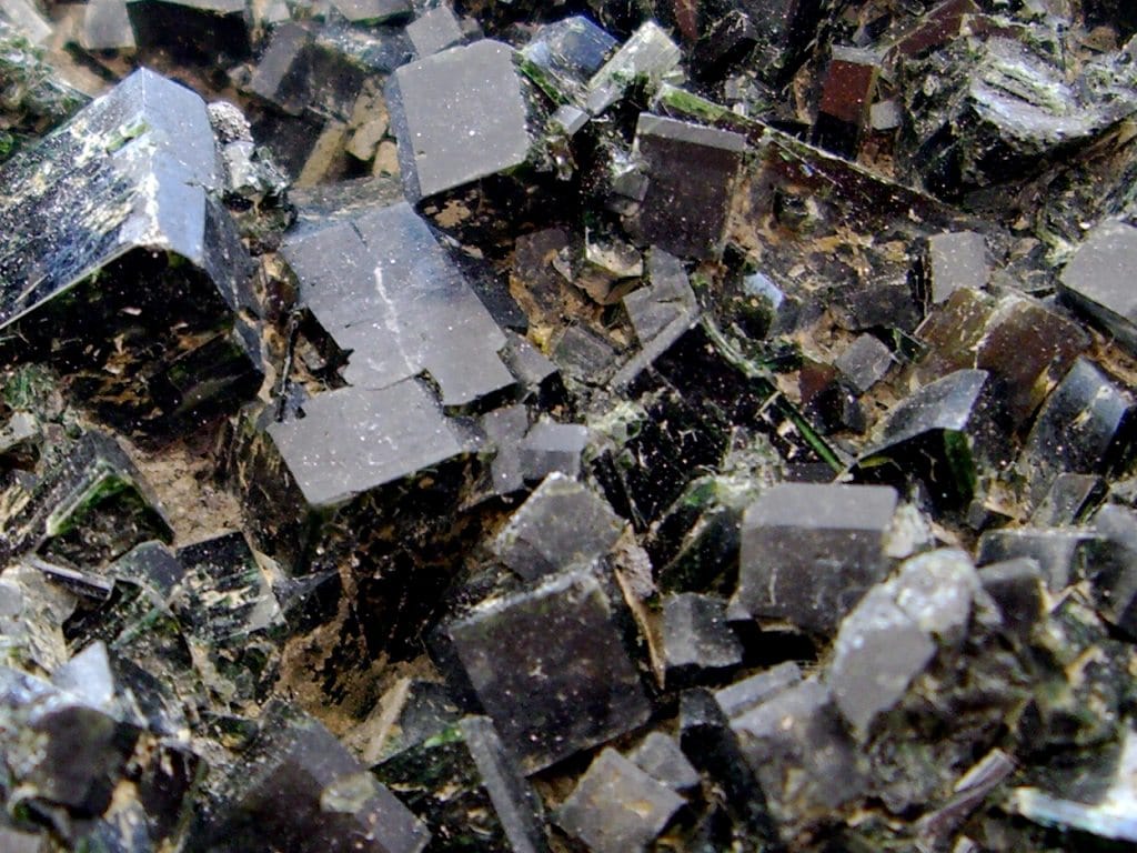 Group of very dark, bright centimetric hedenbergite crystals on matrix.