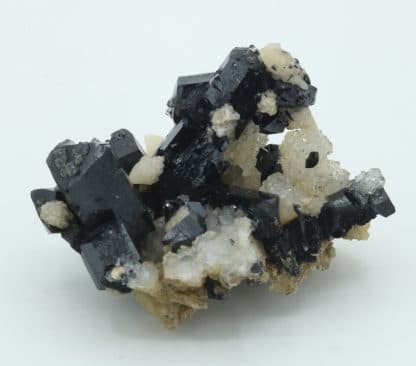 Magnificent specimen with numerous intact, very bright, black Ilvaite crystals, accompanied by quartz crystals.