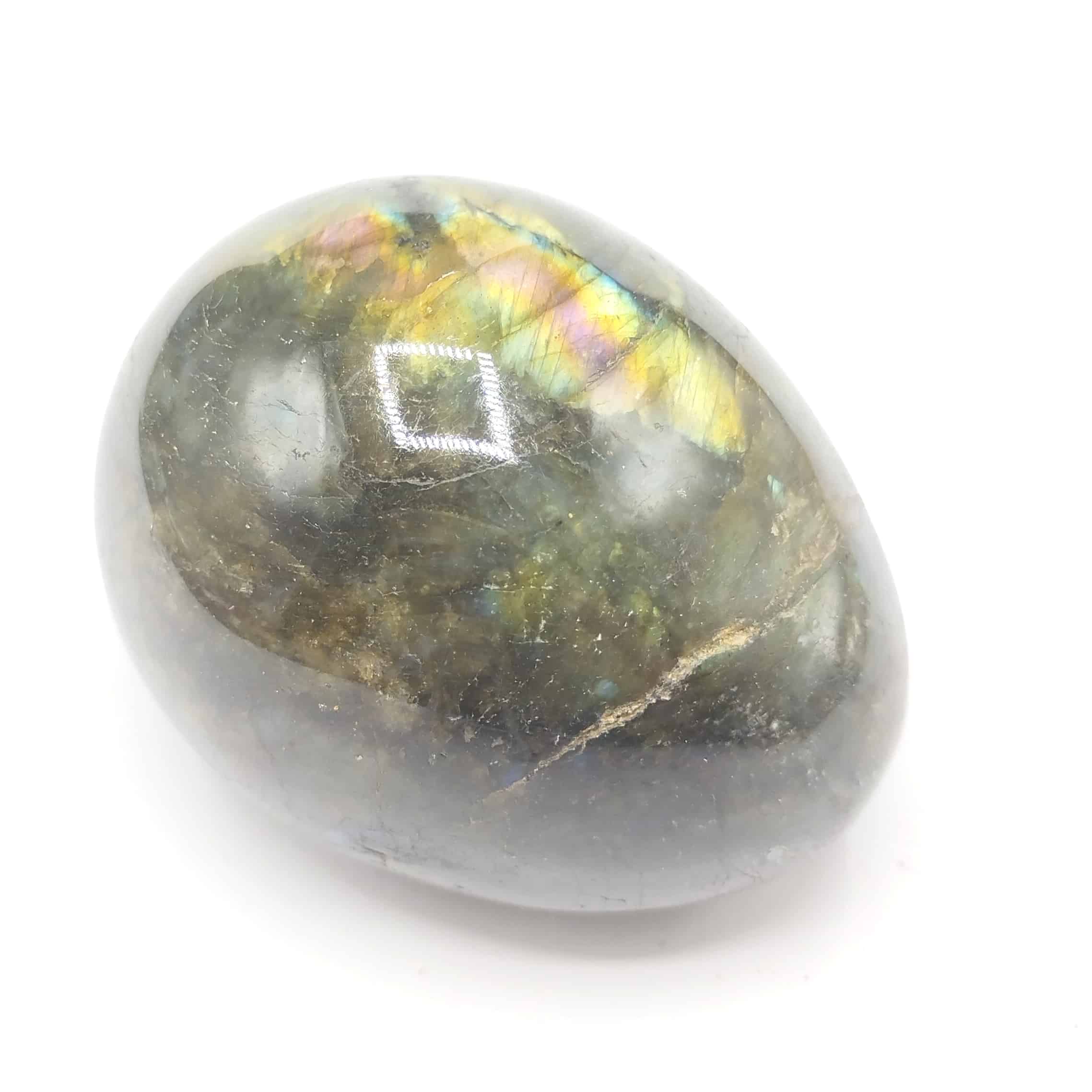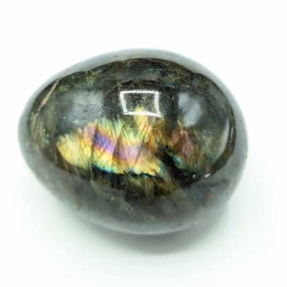 Polished labradorite egg from Madagascar. A small break on the side gives a good view of the adularescence in the solid rock. The phenomenon is known as the Schiller adularescence effect, and is due to the interference of light rays in the inner layers of labradorite.