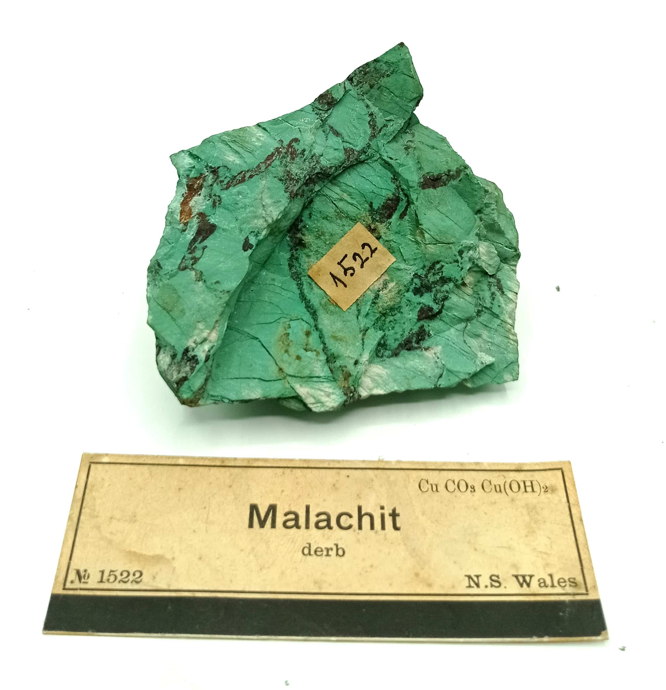 Specimen of massive green malachite with red limonite veins, from Australia.