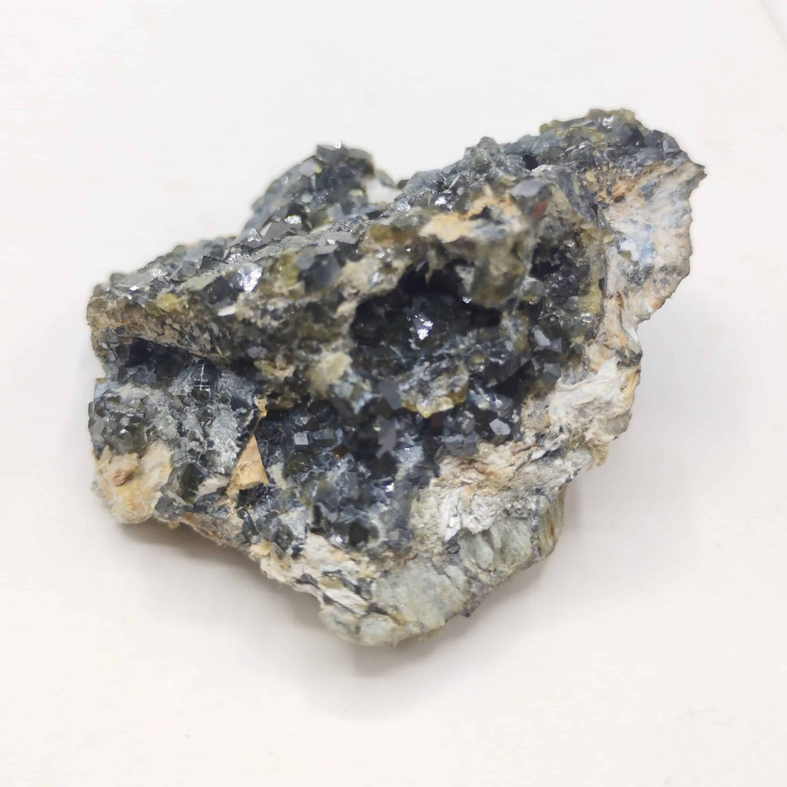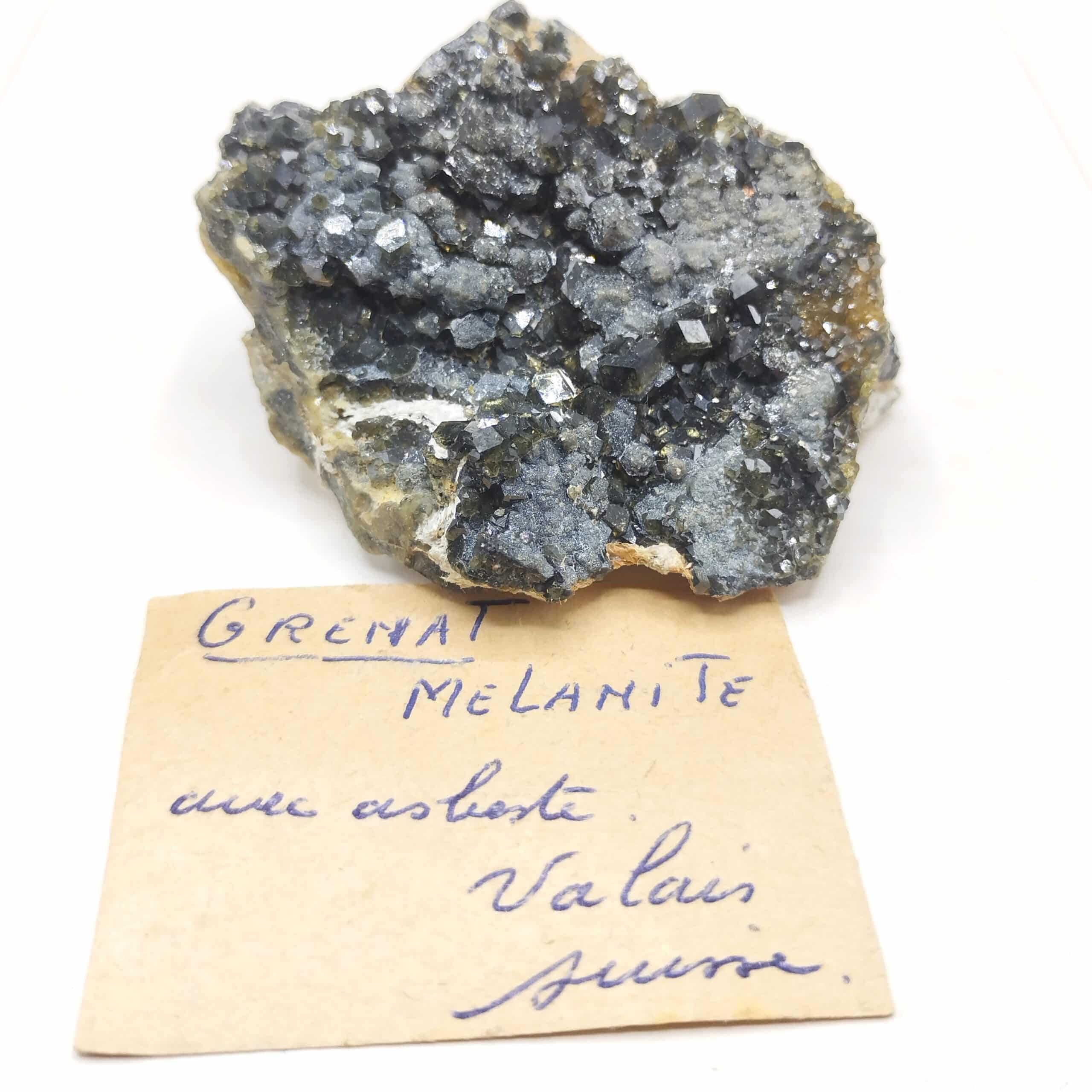 A fine specimen of bright, black melanite garnet (or andradite) crystals from Rimpfischwange near Zermatt, Switzerland.