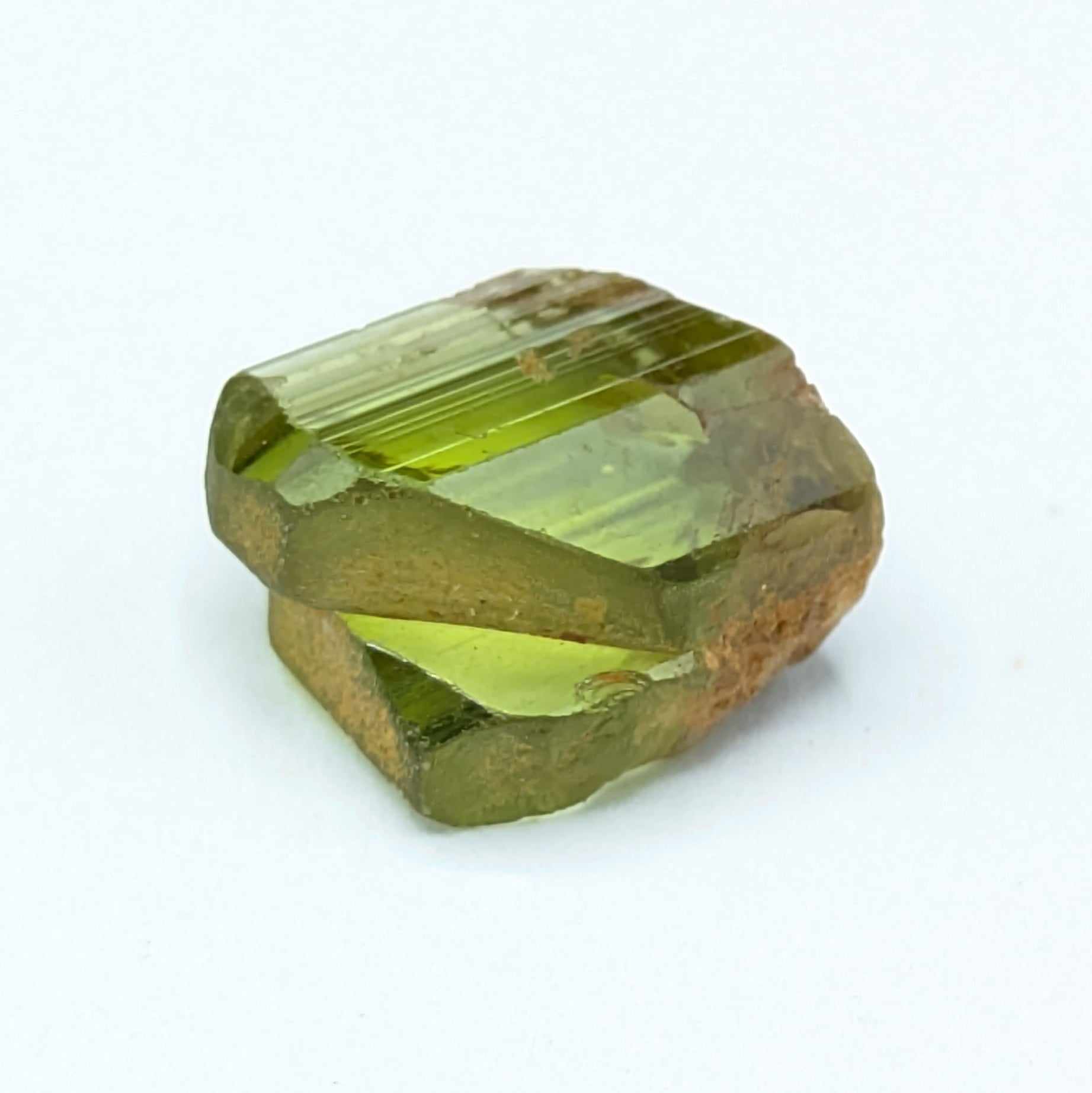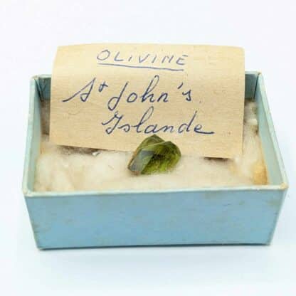 Remarkable green olivine (forsterite) crystal, perfectly finished and gemmy, accompanied by its antique label. Olivine crystal from Zabargad (or St John’s) Island in Egypt’s Red Sea. The island has been known since antiquity for its olivine deposits. Its ancient name “Topazos” is the origin of the word topaz. Superb and unusual!