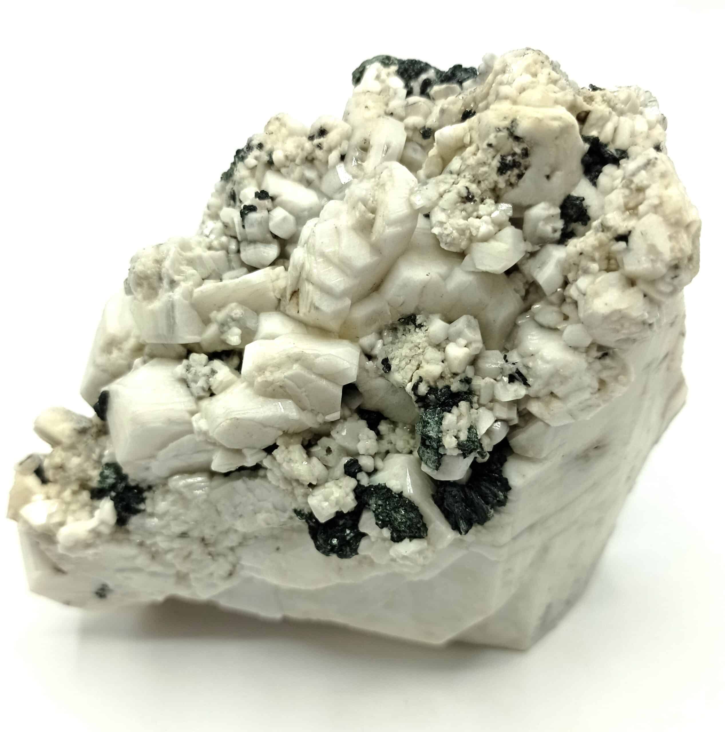 Exceptional set of periclinic crystals, a variety of feldspar, pearly white associated with some green crystals of chlinoclore.