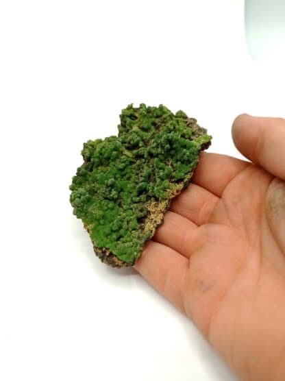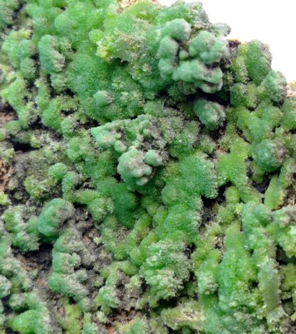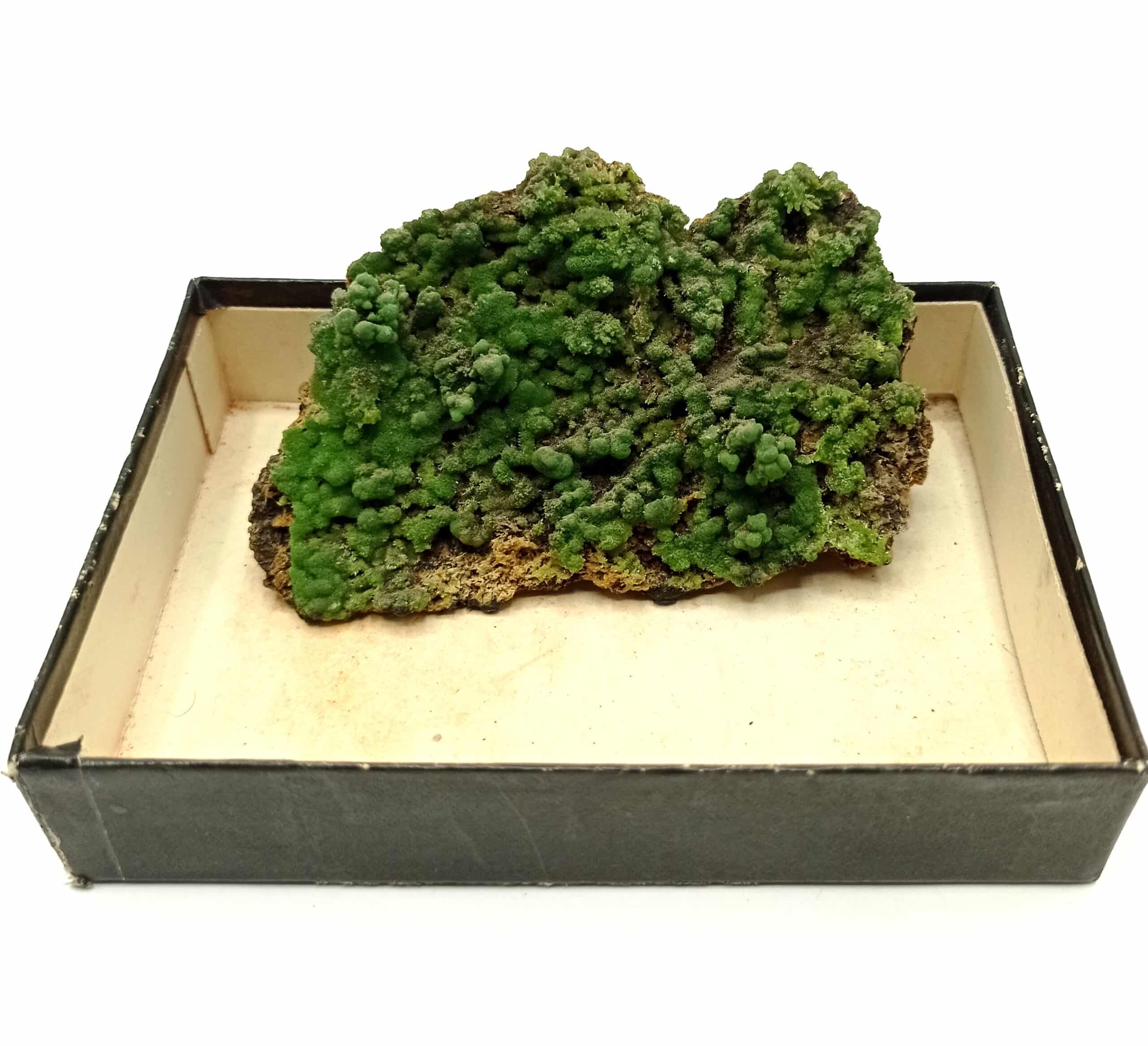 Remarkable historical specimen of green pyromorphite in fine mamelinated crystals on a beige gangue.