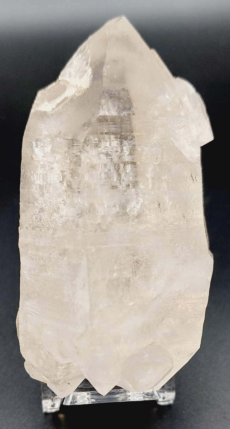 Biterminated hyaline quartz crystal with four points at one end, between which another biterminated crystal is threaded.