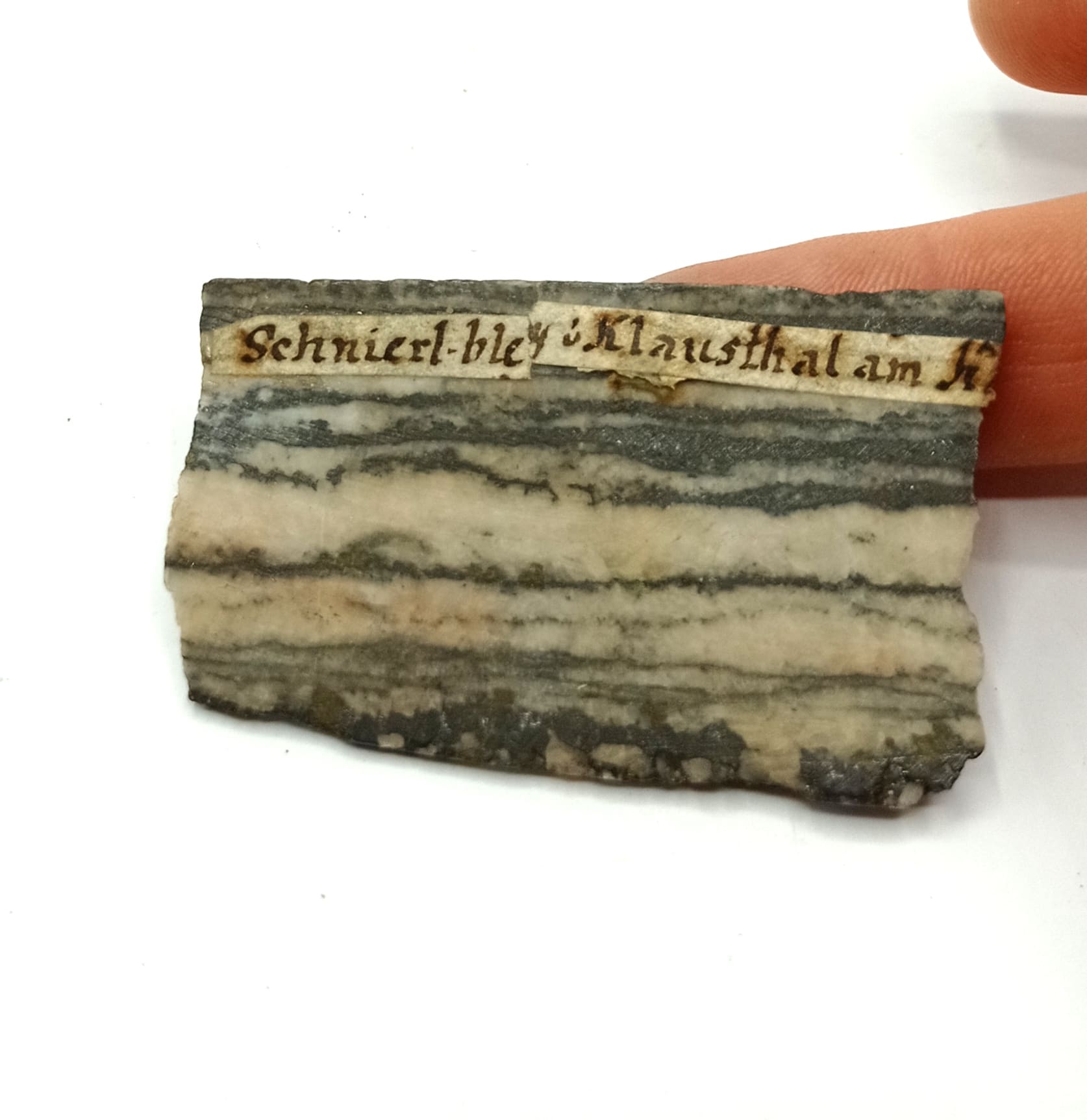 Specimen of banded schalenblende (sphalerite, marcasite, galena and wurtzite) polished on both sides from Schnierl near Clausthal-Zellerfeld, Germany.