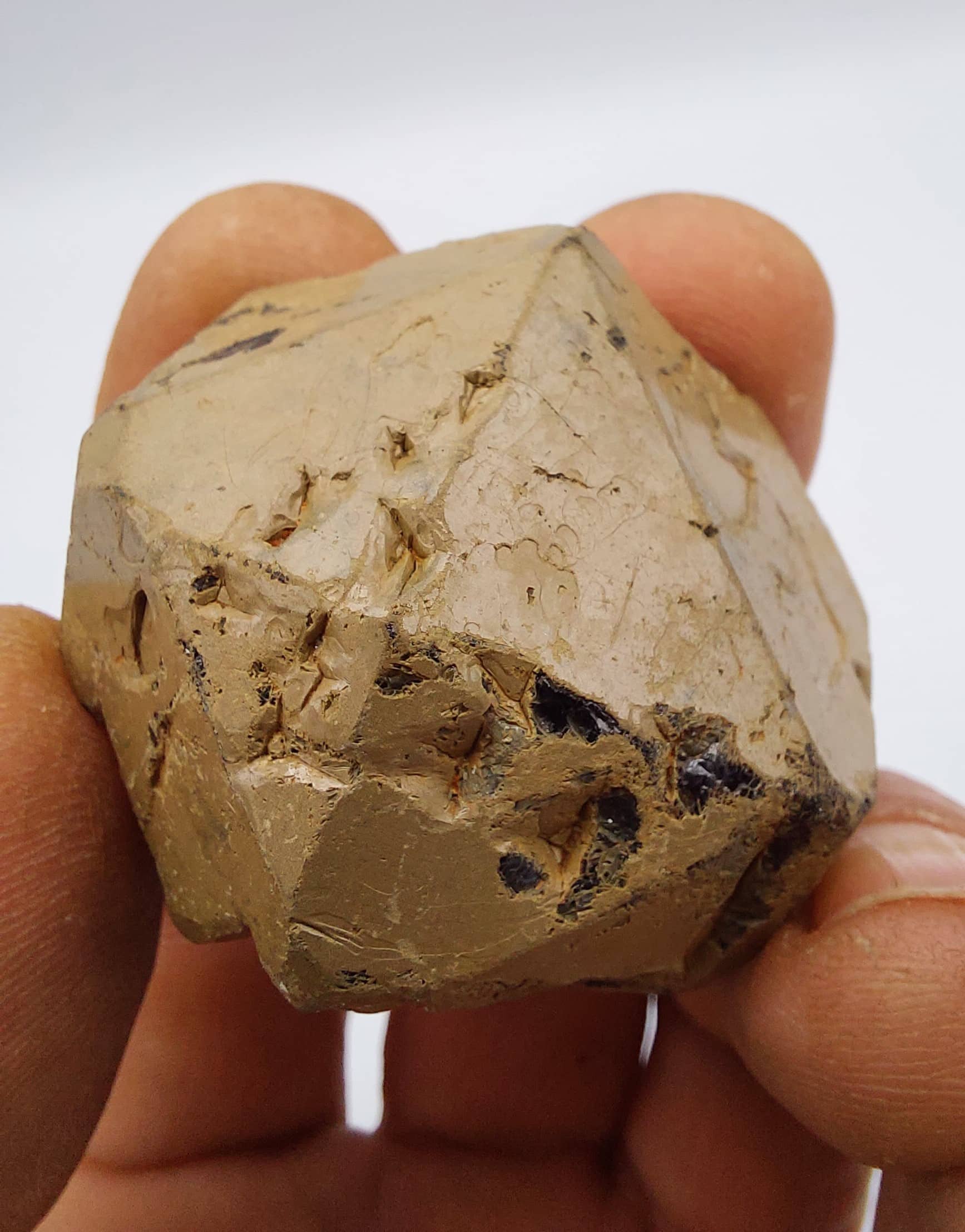 The interior of the crystal is black with sub-metallic highlights and the exterior is beige.