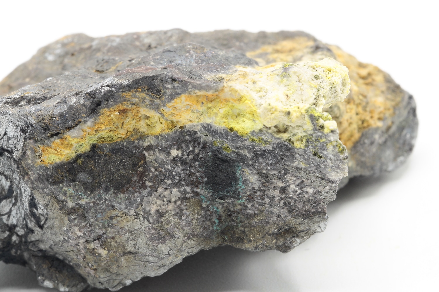 Cluster of massive stibnite crystals associated with stibiconite and “yellow” bournonite (secondary mineral species), mineralogical specimen from the Nades mine in Allier, Auvergne.