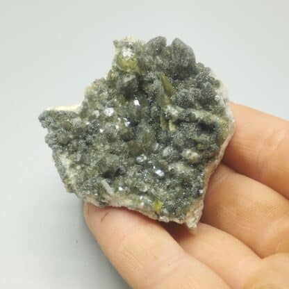 Superb specimen of chloritic quartz crystals, topped with fine hematite crystals and large, bright green titanite crystals. At least 7 titanite crystals, sometimes macerated, top! A few white adularia crystals complete the ensemble.