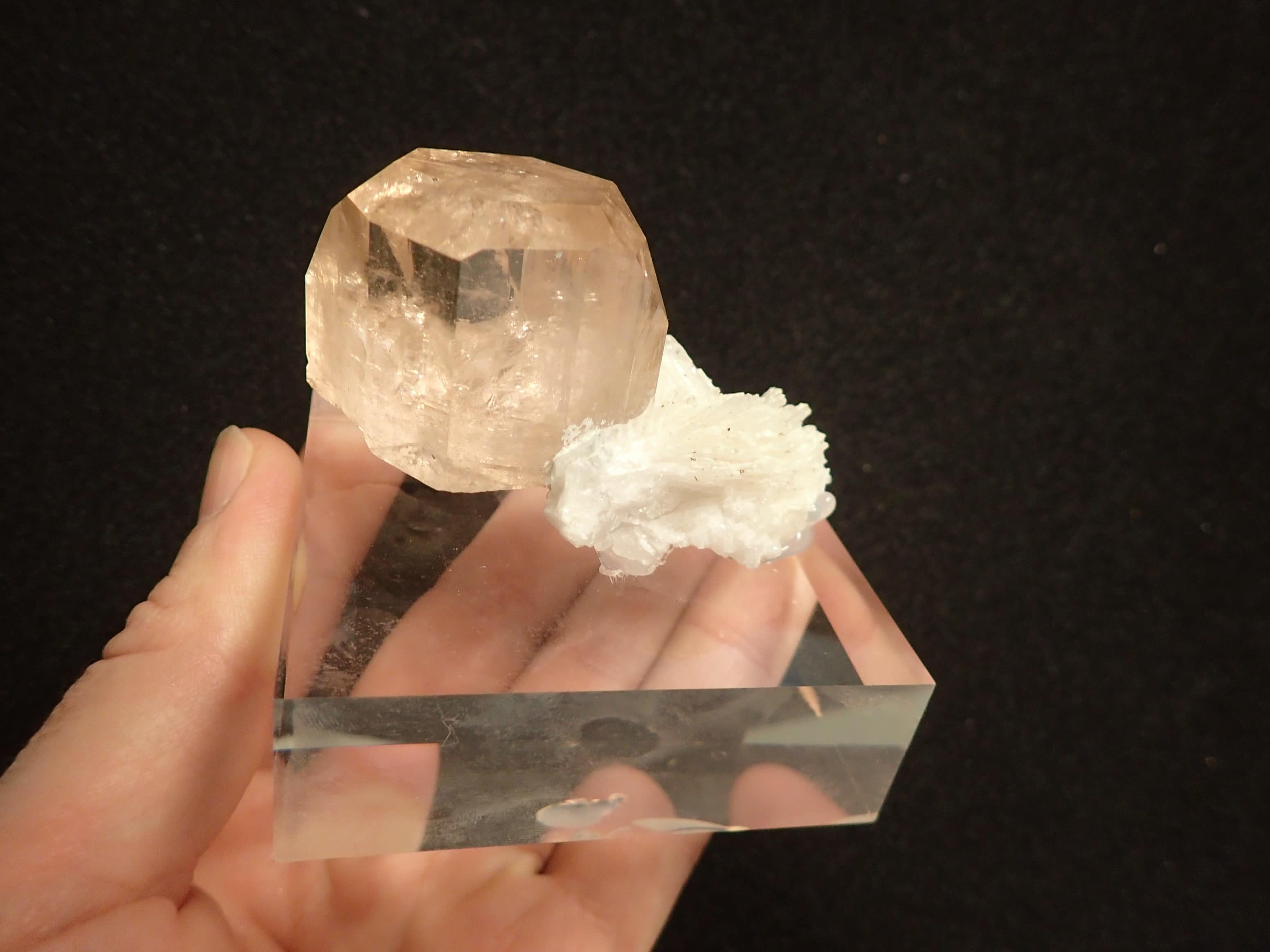 Large crystal of clear and very bright orange-pink topaz on white albite slides from the Shigar valley, Shardu district, Baltistan, Pakistan. The crystal is 4.2 cm in its large diagonal, 3 cm high and 2.9 cm wide. It is arranged on a fan of white albite. The typical faces of the topaz are well expressed and the whole is perfectly aesthetic. Specimen glued on hollowed out acrylic block. A very high quality piece. Video of this topaz from Shigar, Pakistan: