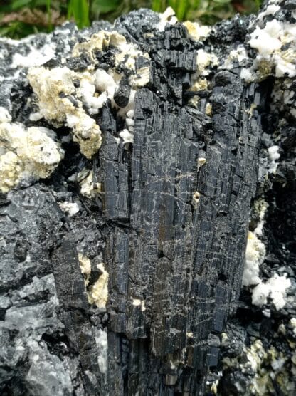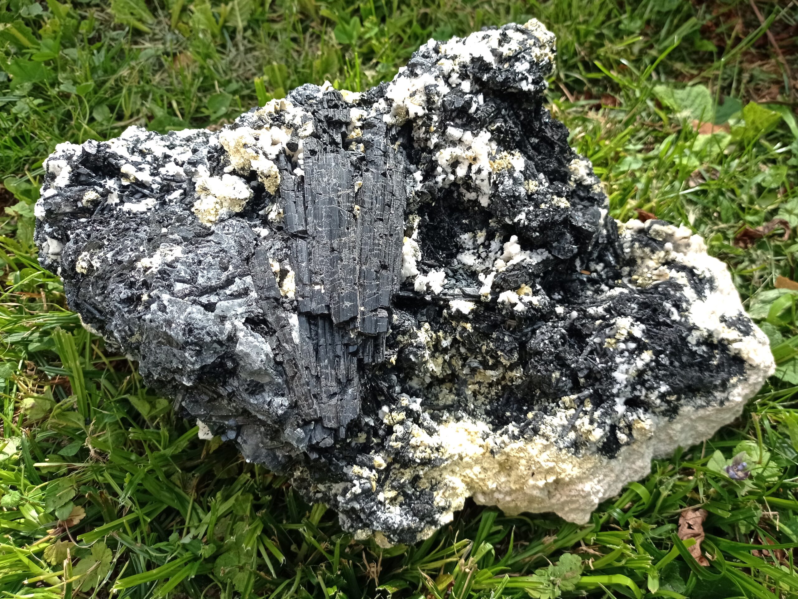 Very imposing specimen with large (up to 10 cm) and very numerous crystals of shiny black tourmaline (schorl) associated with crystals of albite, quartz and also yellow micas (gilbertite variety).