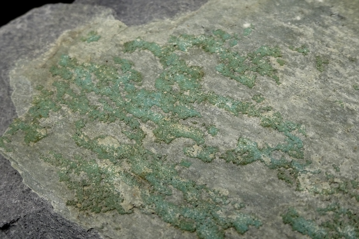 Placage de turquoise globulaire, bleu-vert, sur matrice en provenance de Salmchâteau, réputé pour être la localité type de l’ardennite.