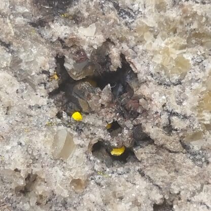 Specimen showing fine yellow crystals of tyuyamunite in a gangue of yellow quartz and calcite. Tyuyamunite is a very rare mineral species. It is a uranyl calcium vanadate. It is a member of the carnotite group. Tyuyamunite specimen from Grants, New Mexico, USA. Delivered with its original Deyrolle label.
