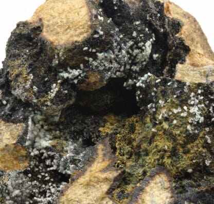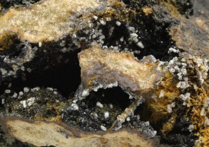 A large boulder whose crevices are lined with shiny, translucent willémite crystals. Specimen discovered at the Rivet quarry in Peyrebrune, Tarn.