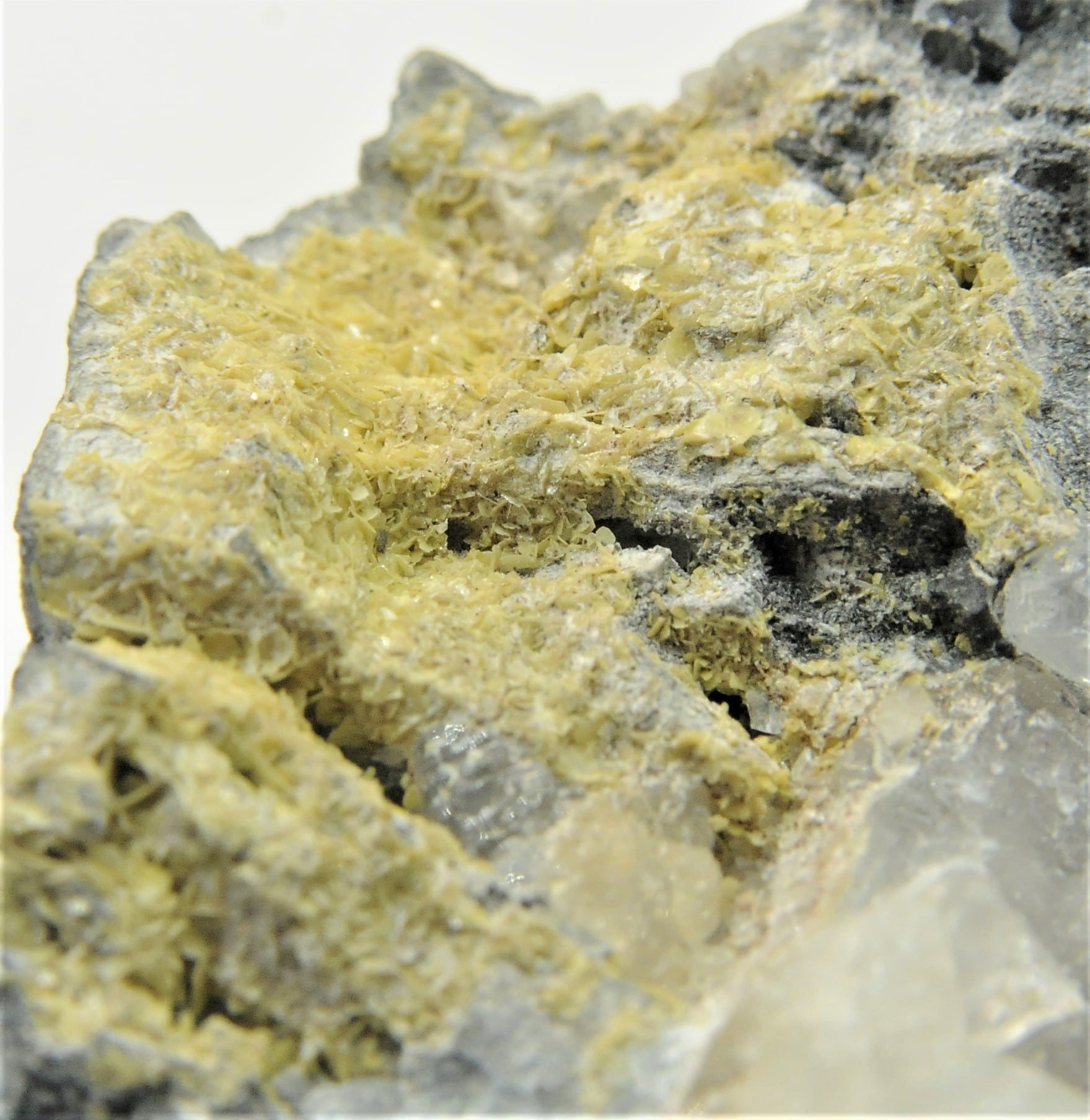 Very fine and rare specimen of yellow wulfenite and hydrocerusite crystals on crystallized galena and quartz.