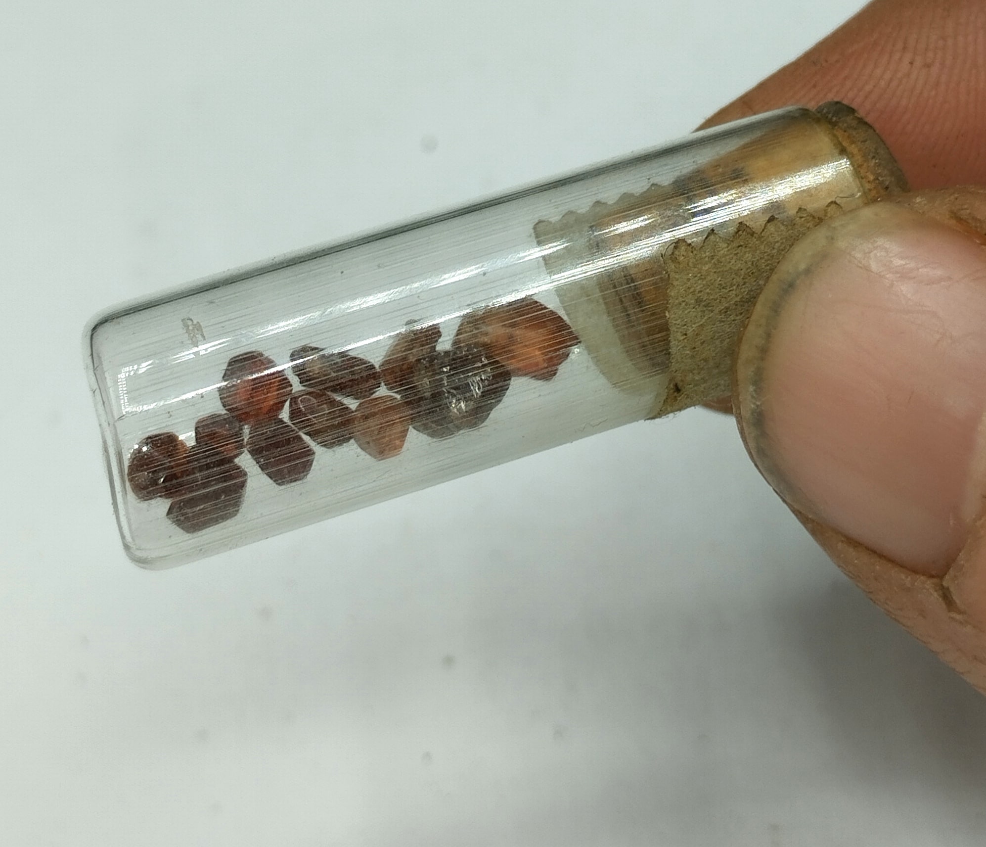 Lovely red and gemmy alluvial zircon crystals from the Riou Pezzouliou, a stream that has also provided good sapphire crystals, located near Le Puy en Velay in the Haute-Loire department. The crystals are presented in an old test tube with a cork stopper. Former Royat cutter’s stock.